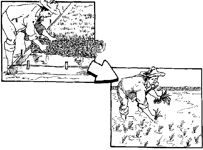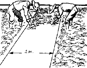 3. Transplanting. If possible, use only seedlings of high quality (high viability, pure, healthy, etc.) seeds. To ensure uniformity of growth end easy identification of off-types, transplant only 1 seedling/hill, in straight rows.