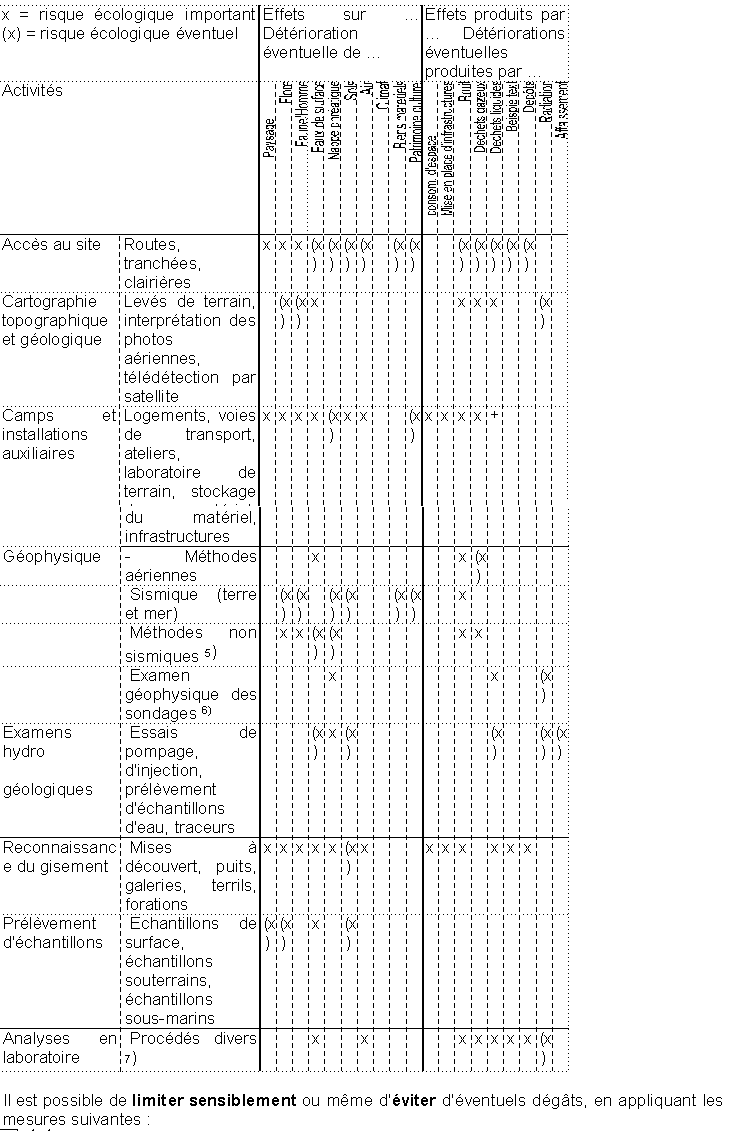 Les risques pour l'environnement liés à la reconnaissance, la prospection et l'exploration peuvent se manifester sous différentes formes. Au fur et à mesure que l'on progresse d'une de ces étapes à l'autre, l'importance des répercussions sur l'environnement va en s'accroissant. En ce qui concerne les deux premières, elles sont généralement faibles et de nature passagère. Quant aux travaux exploratoires, ils nécessitent des moyens assez substantiels et les frais occasionnés constituent dans ce cas un mécanisme régulateur limitant les excès.