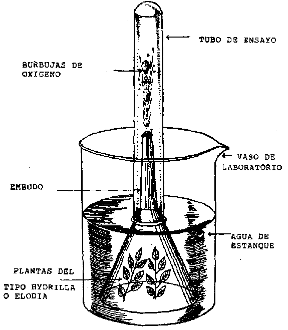 Procedimiento: Se sumergió el aparato en un vaso de laboratorio lleno de agua y se colocaron las plantas Hydrilla bajo el embudo. Se llenó el tubo de ensayo con agua para que el oxigeno producido por la planta desplazara el agua y proporcionara un dispositivo de medición conveniente. Se colocó una bombilla de luz Bajaj de 60 vatios a 5 cm. de la planta, dejándola encendida por una semana. Cada 24 horas se anotó y registró la cantidad de oxigeno emitida y se probó ésta por absorción en pirogalol alcalino (ácido pirogálico disuelto en alcohol).