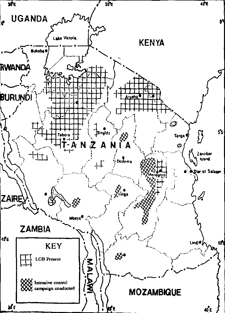 Map 1: Geographical distribution of LGB in Tanzania - April 1988