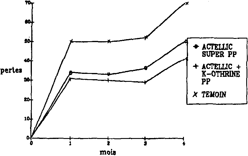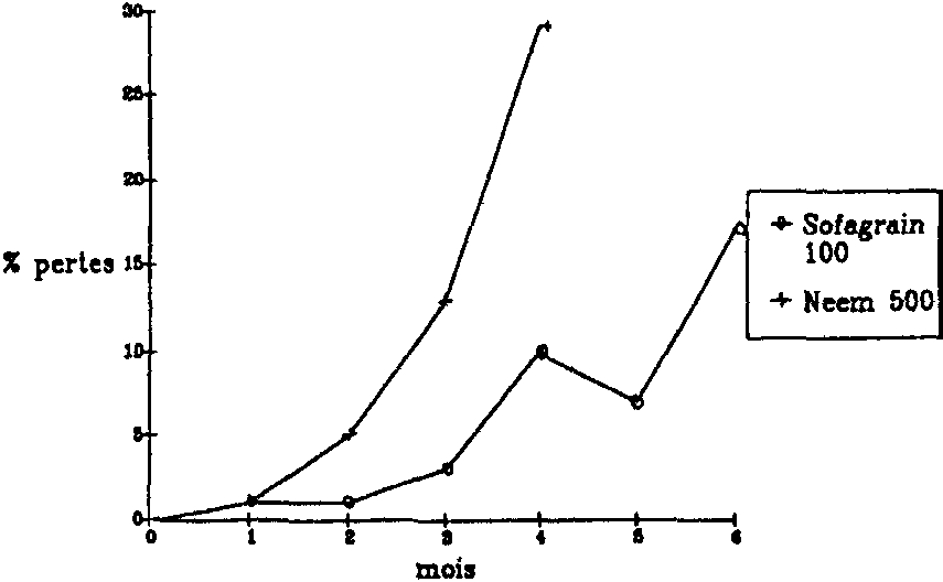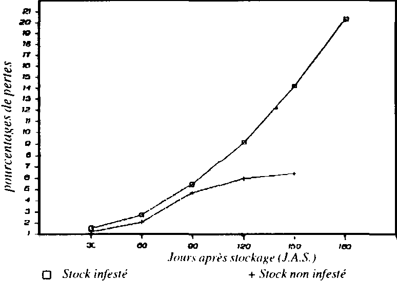 Enfin, pour mieux se préparer à la lutte biologique contre P. truncatus, le Service National de Protection des Végétaux a engagé depuis 1989, une étude d'évaluation des dégâts et pertes causés par le parasite dans les greniers traditionnels de maïs. Cette évaluation a permis de constater en 1989 que les pertes occasionnées par les parasites des stocks sont importantes dans les stocks infestés par P. truncatus (20,5% après 6 mois de stockage) (Fig. 7 et 8).
