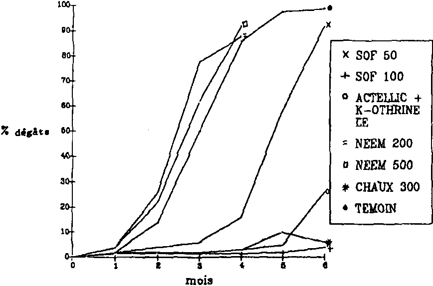 - Sur maïs grains, les binaires composés de pirimiphos-méthyl + deltaméthrine se sont aussi avérés les plus efficaces, les dégâts ayant été généralement maintenus à moins de 10% jusqu'à 6 mois de stockage (Fig. 6).