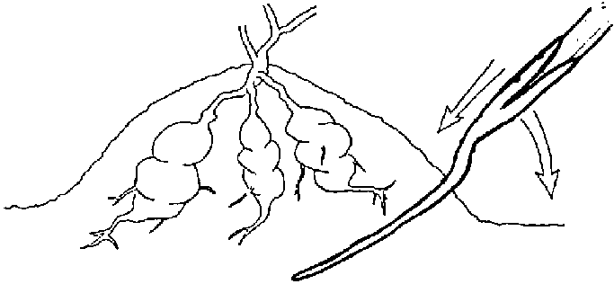 Tools used to lift root crops are a matter of personal choice and/or tradition. As shown in Figure 3.3. (see Figure 3.3. Harvesting tools for root crops) below, they include: digging sticks, cutlasses (machetes), hoes or digging forks. Always use sharp instruments with great care so as not to wound or cut the produce because this will give rise to rapid spoilage by soil-borne pathogens.