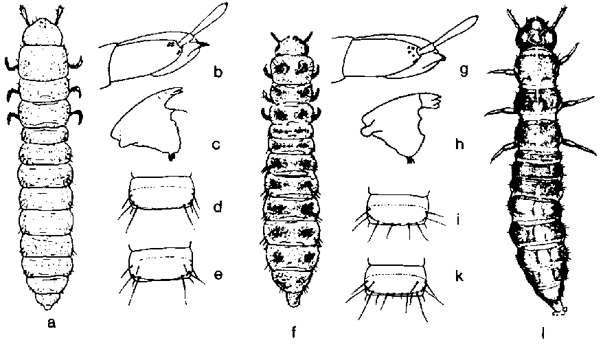 - Les taches pigmentées associées de chaque côté de la tête aux 6 ocelles ne sont pas disposées en groupes, mais séparées, à distances plus ou moins égales les unes des autres (fig. 77 g). La pointe dentée des mandibules a un contour rectangulaire (fig. 77 h). Plaques dorsales des segments thoraciques avec 2 taches brun clair à brun foncé (fig. 77 f). Bord posté rieur des segments abdominaux avec, au moins, 2 paires de longs poils (fig. 77 i,k).