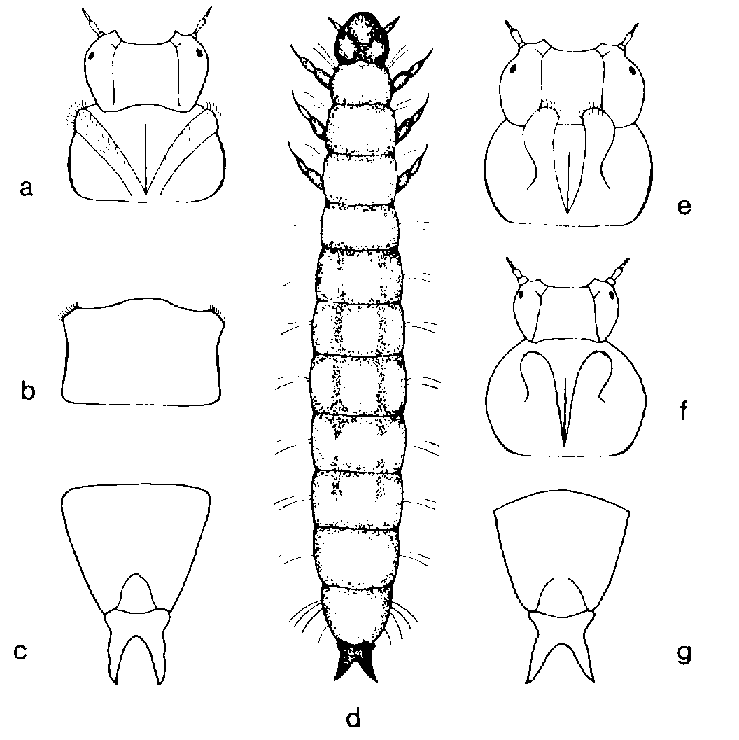 1. Larves jusqu'à 28 mm de long. Dernier segment abdominal avec une rangée dorsale de courtes soies à sa base et 2 soies épineuses sur le côté de chacune des épines terminales (urogomphes) dont la pointe est dirigée vers le haut (fig. 82 A)