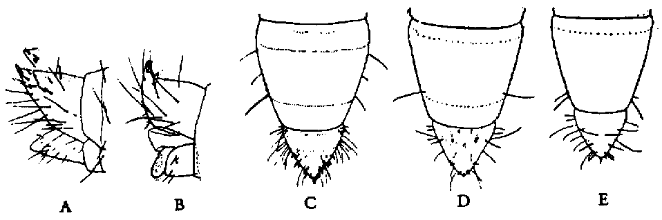 4. Les épines terminales sont très grandes, à peine plus courtes que le reste du dernier segment abdominal. Leur base correspond à environ 1/3 de la plus grande largeur du segment (fig. 81 C)