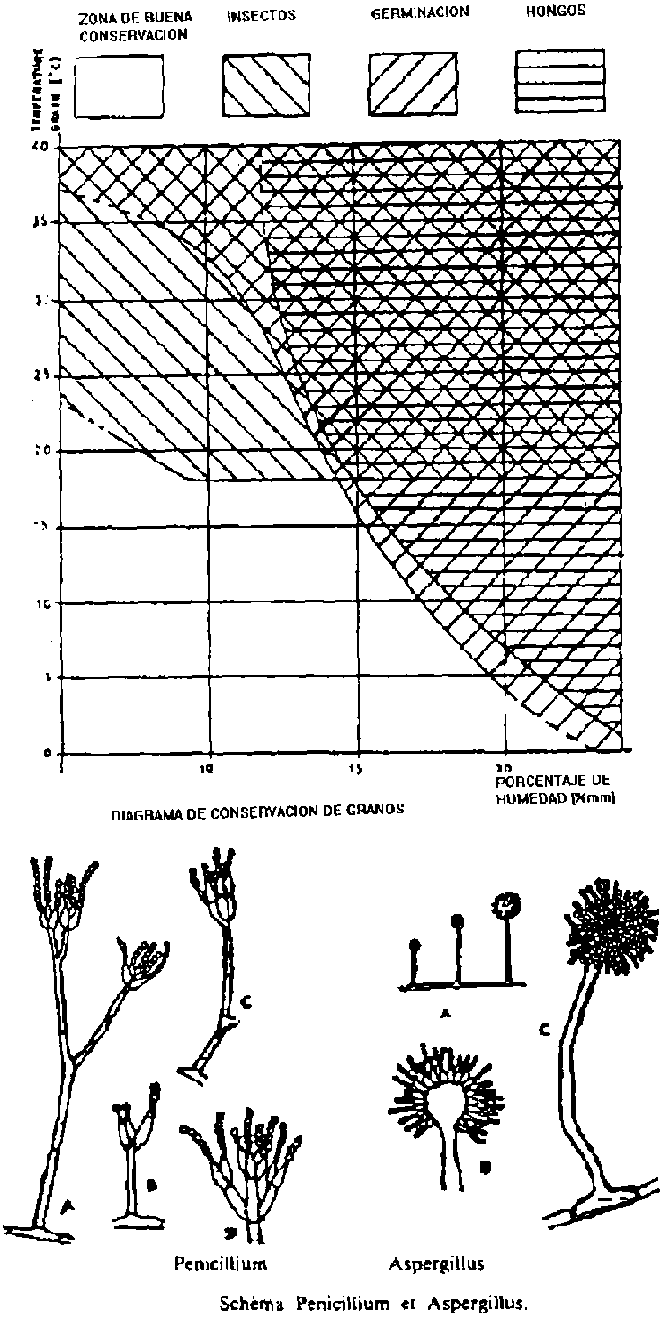 Se notará que los granos oleaginosos, soja y cacahuetes, necesitan una tasa de humedad inferior al de las leguminosas, en particular los cacahuetes descascarados. Por la fragilidad de este último grano. Esto no basta desgraciadamente para proteger los stocks de los ataques de los parásitos, particularmente de los gorgojos. Es por eso que un método empírico, adoptado y fuertemente perfeccionado por la técnica moderna, consiste en llenar los recipientes al máximo y taparlos de modo hermético a fin que el aire intersticial esté haciéndose más escaso é inerte y anestesie ó incluso, asfixie las larvas y los insectos. Cuando se trata de mayores cantidades y de recipientes o locales no herméticos, es recomendado tratar el stock con polvos insecticidas. A continuación, se encontrarán algunas cifras de pérdidas relativas a las habichuelas y a la soja sacados del estudio nacional brasileño ya citado: