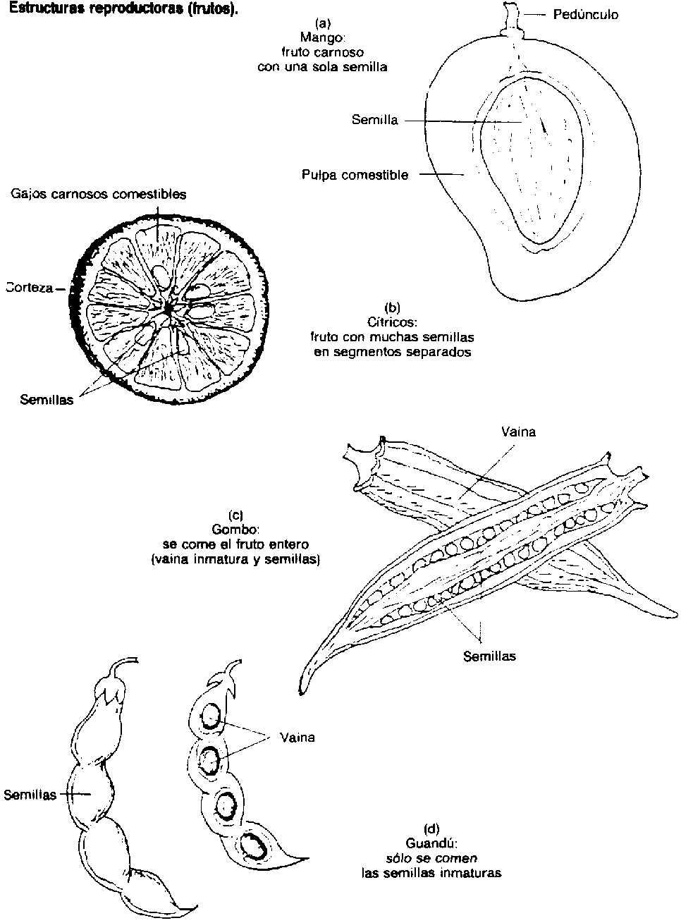 | Frutas carnosas con varias semillas | Tomate cítricos (naranja, pomelo mandarina, lima), pepino, pimiento, berenjena, banano (Figura 6b) |
