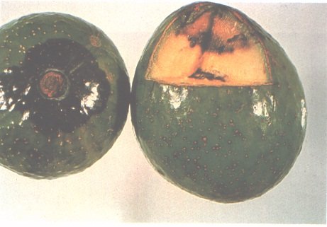 3. Infección de una lesión. El pudrimiento de la zona contigua al pedúnculo se debe a la infección de la herida producida al arrancar el fruto. Foto: Scott Ledger y Tony Cooke, Departamento de Industrias Primarias de Queensland.