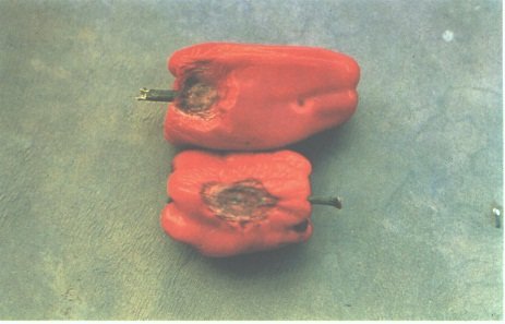 4. Antracnosis en pimientos. La infección ataca al fruto verde en el campo, pero no se inicia la descomposición hasta después de la cosecha, al madurar el fruto.