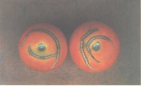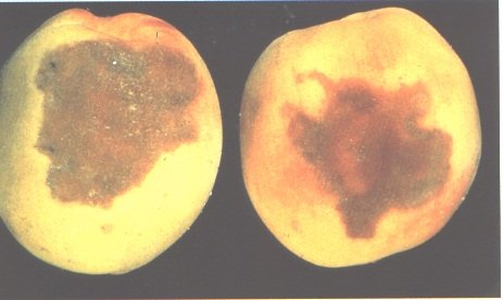5. Daños químicos. Fruta embalada en cajas de madera blanda tratada con pentaclorofenato; sólo resultaron dañados los melocotones que estaban en contacto con la caja. Foto: Departamento de Industrias Primarias de Queensland.