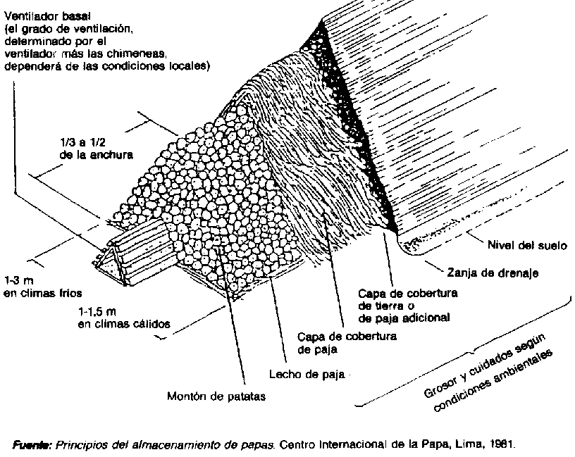 Se trata de una solución sencilla y de bajo costo para almacenar raíces y tubérculos, especialmente papas, en Europa y América Latina (Figura 35). Las papas se amontonan sobre una capa de paja de 1 a 3 m de anchura, o de 1,5 m como máximo en climas húmedos. Por el fondo debe pasar un conducto de ventilación. Las papas amontonadas se cubren con unos 20 cm de paja comprimida, que puede cubrirse a su vez con una capa de tierra sin apisonar de hasta 30 cm de espesor.
