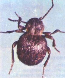 Descripción. El adulto es diminuto, ligeramente oblongo y aplanado. Los costados de la frente de la cabeza están proyectados y extendidos hacia atrás, sobre la parte frontal de los ojos. La longitud del adulto es de 2,5 a 3,0 mm. Su color es café rojizo.