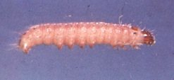 Biología. Las hembras depositan de 100 a 500 huevos aislados o en grupos en los productos almacenados. La larva, cuando está completamente desarrollada mide aproximadamente 13 mm de longitud. Es de color blanquecino, pudiendo ser ligeramente verdosa o con tintes rosados. Tiene tres pares de patas verdaderas y 4 pares de falsas patas en el abdomen. La larva totalmente desarrollada hila una tela sedosa, dejando hilos de seda cuando se arrastra en donde se acumulan deyecciones de la larva y partículas de producto y llega a cubrir la superficie del producto infestado con esta tela. La transformación de hueveclilo a adulto demora, aproximadamente 26 días. Generalmente no completa su desarrollo bajo 10° C. Los adultos son de corta vida y no se alimentan de productos almacenados.
