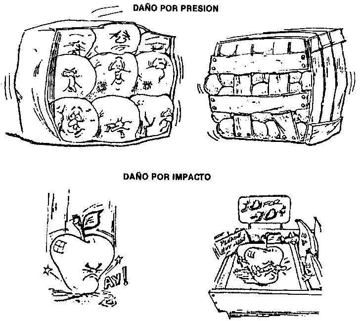 Se pueden identificar cuatro causas diferentes de daño mecánico al producto: cortes, compresiones, impactos y raspaduras por vibración. La cosecha y el posterior manejo cuidadoso del producto eliminarán la mayoría de los riesgos asociados con cortes y heridas del producto. El magullamiento por compresión puede evitarse empacando en recipientes lo suficientemente fuertes como para resistir múltiples estibamientos, que relativamente sean poco profundos para no permitir demasiadas capas del producto, ya que se pueden aplastar las del fondo del envase, y que tampoco permitan el excesivo llenado. El daño por Impacto y magulladuras frecuentemente es causado al dejar caer el envase y por los golpes en el transporte (excesivas frenadas, aceleraciones y por ir demasiado rápido en caminos en mai estado). Son causas comunes de caldas, envases demasiado grandes que no pueden ser manejados con facilidad (por ejemplo cajas de 50 kg.) o envases sin asas o agarraderas incorporadas. Las raspaduras del producto por vibración provienen de la vibración que el transporte transmite al envase, lo que causa abrasiones que van desde ligeras marcas de fricción, hasta pérdidas de piel o algo de la pulpa. Estos factores se resumen en las figuras 31 y 32.