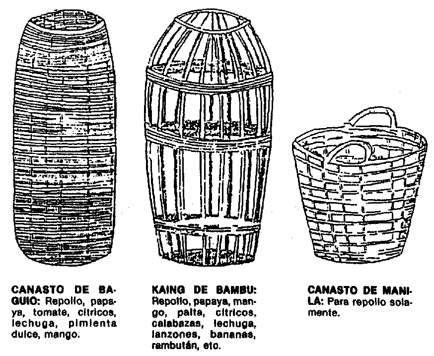 Los envases deben ser fáciles de manejar y estibar, no demasiado pesados y de dimensiones y formas apropiadas para adaptarse al vehículo de transporte. Los canastos redondos de bambú no pueden estibarse tan eficazmente en los vehículos como las cajas rectangulares y por lo tanto su relativo bajo costo debe ser comparado con los costos adicionales del transporte. Los exigentes requerimientos de empaque de diversos mercados deben ser siempre especificados por los compradores y pueden variar de una provincia a otra y también con los cambios en las preferencias del mercado. Existen en uso numerosos tamaños de envase en todo el mundo, muchos de los cuales han sido cuidadosamente evaluados con respecto al producto y el sistema de mercadeo utilizado por el comercio local. Otros han sido adoptados para uso general en varios tipos de productos y sistemas de mercados, sin una evaluación completa y por lo tanto todavía necesitan mayores refinanamientos (Figuras 35 y 36).