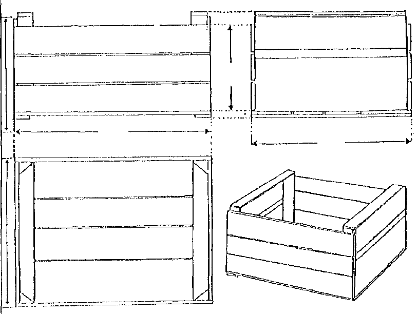 Madera. Las cajas de madera, como las que se ilustran en la Figura 39, se usan ampliamente en muchos paises y pueden ser fabricadas de madera aserrada para cajas re-utilizables o de madera enchapada blanda de variados grosores para envases más livianos. Las tablas de álamo se usan extensamente, pero no siempre hay disponibilidad de ellas. Las cajas de madera tienen las ventajas de ser rígidas, re-utilizables y a menudo disponibles localmente Sus desventajas son: