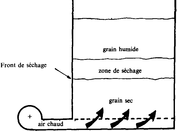 Au contact des grains, l'air se charge en humidité jusqu'à la teneur en eau d'équilibre avec l'humidité des grains. Si la couche est suffisamment épaisse, on peut définir une ligne fictive dite «front de séchage» au-delà de laquelle l'air sera dans l'impossibilité de sécher davantage. Ce front de séchage se déplace du front d'attaque de l'air vers la surface du grain avec une vitesse qui est fonction: