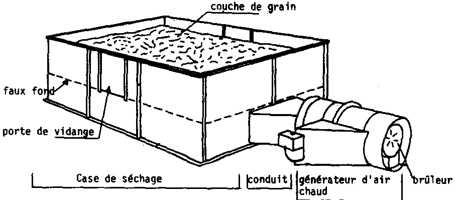 Ce séchoir est constitué d'un brûleur, d'un ventilateur, d'un conduit d'air chaud et d'une case rectangulaire à faux-fond en bois ou en métal. Cette case de 1,9 m x 2,8 m permet de sécher 1 tonne de paddy de 28 % à 14 % en 4 à 6 h (Fig. 28 et 29).