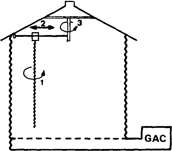 Il s'agit ici d'un séchage statique en couches très épaisses (jusqu'à 4 m) dans des cellules circulaires métalliques. Pendant le séchage, le grain est brassé en permanence par un ensemble automatique de une ou plusieurs vis animées de 3 mouvements simultanés (Fig. 34).