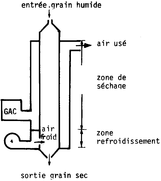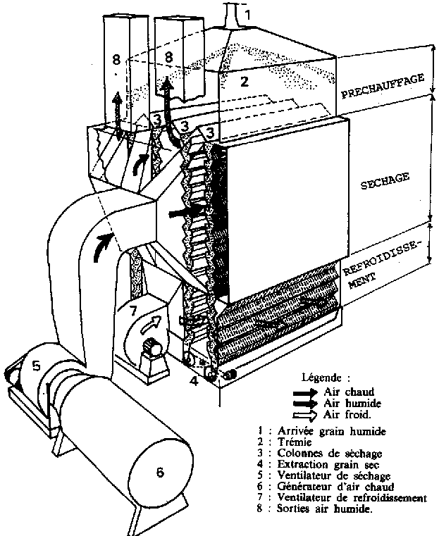 Le grain humide entre dans le séchoir par un orifice (trémie) équipé d'un dispositif automatique de régulation du débit. Dans un premier temps, il est réchauffe par de l'air humide ayant servi au refroidissement et recyclé pour employer la chaleur encore contenue par cet air. Le grain passe ensuite dans la zone de séchage où il est traversé par l'air chaud venant du générateur; enfin il passe dans la zone de refroidissement où il est traversé par un courant d'air ambiant.