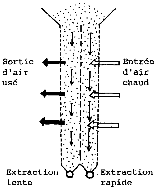 L'air chaud entre dans les gaines à partir d'une chambre de mise en charge latérale. Les gaines sont obturées alternativement côté chambre d'air chaud et côté chambre d'air usé, de sorte que l'air chaud sort par le dessous de la gaine et circule dans le grain jusqu'à ce qu'il atteigne la gaine de l'étage voisin par laquelle il est évacué vers la chambre d'air usé. La longueur du trajet de l'air est de 15 à 20 cm.