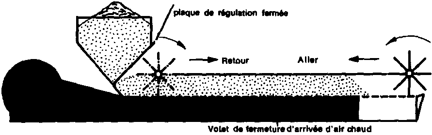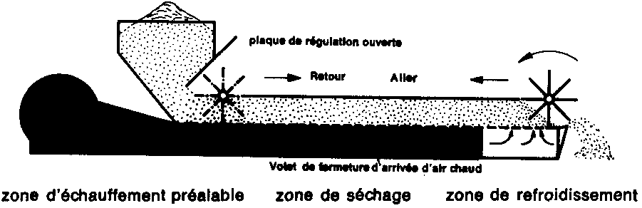 Les grains progressent sur la table de séchage depuis la trémie d'alimentation jusqu'à l'extrémité du séchoir, sous l'action d'un agitateur muni de palettes qui se déplace tout le long de la table de séchage. En remontant vers la trémie, l'agitateur rejette les grains vers l'aval, puis repart à l'aval en roulant sur les grains sans les déplacer (palettes «libres»). La durée du séchage est réglée par la vitesse de déplacement du tambour (Fig. 44).