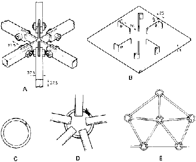 The balloon is fixed to a geodesic dome of wood and steel whose perimeter is immersed in the water seal. The balloon, made of heat-welded PVC panels, is tied inside the geodetic frame and is folded outside under the bottom of the frame. The original design for this structure involved hub joints requiring welding and precision carpentry (fig. 2A and B), both usually unavailable in villages. In an improved, simplified design, the hubs are just 6-mm steel rods bent into a ring shape, and PVC pipe or bamboo rods (exactly drilled) form the struts (fig. 2C-E). A geodesic structure of this simplified design was built in half a day in the village. The balloon was just a whole sheet of PVC or polyethylene film that was neither heat-sealed nor welded. The cost of this dome and balloon was about one-tenth that of the first unit.