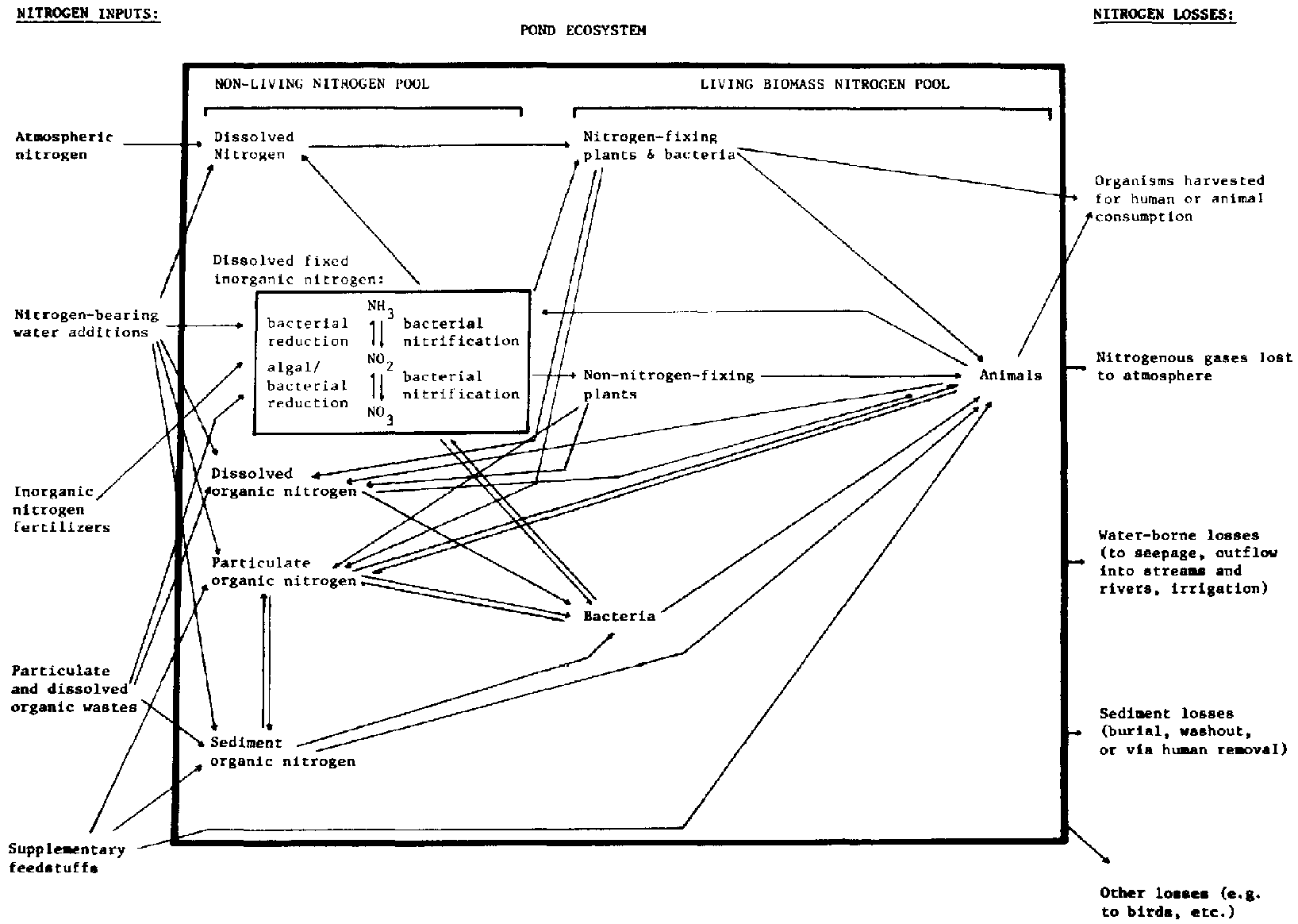 The principal pathways of nitrogen in ponds are illustrated in Figure 2. Possible nitrogen inputs to intensively managed polyculture ponds may be many and varied: atmospheric nitrogen, and nitrogenous substances present in in-flowing water, in inorganic fertilizers, in organic wastes, and in feeds. Similar diversity is also present in losses of nitrogen from ponds. Measurement of nitrogen flow between the various nitrogen pools (e.g., dissolved nitrogen pool, bacterial nitrogen pool, etc.) is a difficult task, requiring sophisticated techniques. For the present, aquaculturists are utilizing information on a few such inputs, pathways, and pools, and are only very slowly evolving models allowing prediction of harvests of fish from a pond given a specified set of conditions.
