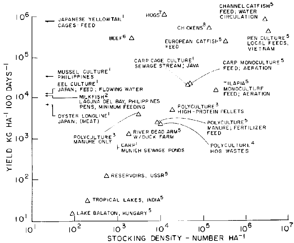 The animal protein yield to man in natural waters of the temperate zone ranges from less than 20 to several hundred kg/ha (Figure 4). There are specific sites, often with inadvertent fertilization by run-off, where yields are much higher: a dead river arm in Hungary with a slow flow that also serves a duck farm produces 1.3 tons/ha/100 days, and a portion of the lake Laguna del Bay in the Philippines, the shallow recipient of much agriculture) and domestic drainage where the wind also concentrates the plankton, is capable of producing 3 tons or more of milkfish per ha/100 days; however, the site is now plagued with pollution from highly populated shores.