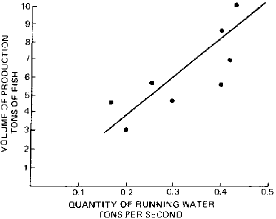 The relationship between fish stocking, density, and water flow rate is illustrated in Figure 5. Although these values are species-specific, the benefits of increased oxygenation and removal of toxic body metabolites by rapid water exchange hold true for most species.