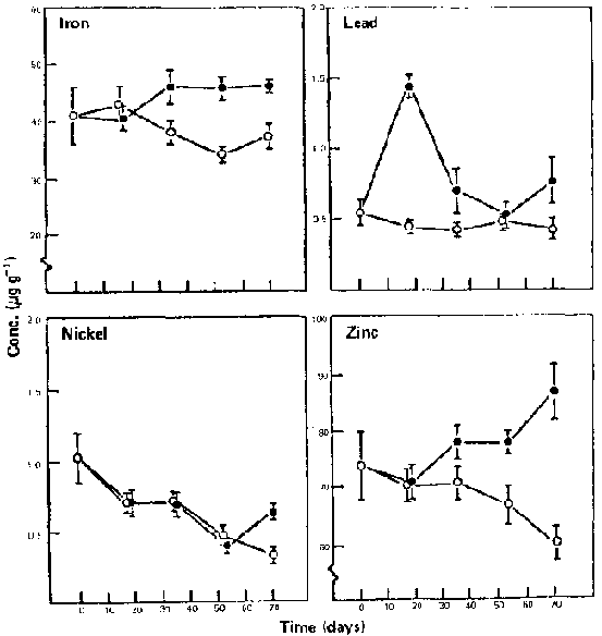 Where sanitation is advanced, investments in rendering sewage effluents innocuous and infertile are so great that sewage aquaculture can only be envisaged when cost of invested capita) need not be considered. That is, in the temperate zone and in technologically advanced countries, one may think of planning sewage aquaculture for small to medium-sized towns with readily available cheap land or a nearby lake. Installations will be necessary to separate domestic sewage from all other liquid effluents such as industrial wastes and nonsewage domestic and stream run off components. Even then, big-accumulation of toxic substances may occur (11). The actual levels of trace metal accumulation will be species- and site-specific. For example, rainbow trout fed a diet containing activated sludge selectively accumulate certain metals, but not others (Figure 6).