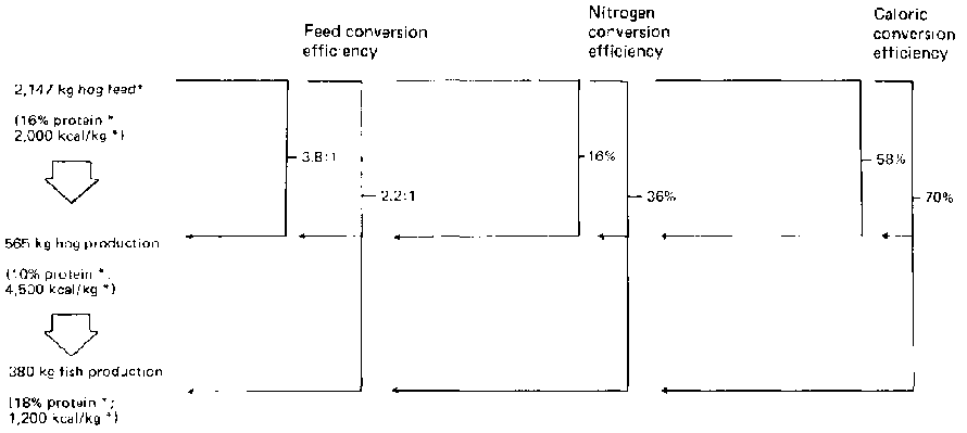 In the hog-cum-fish system (Figure 7), overall productivity of biomass was increased by 67 per cent - with no additional feeding or fertilizer - by providing swine wastes (uneaten food, faeces, urine) to a polyculture pond. Food conversion efficiency increased from 3.8:1 in the hog-only system to 2.2:1 in the hog-cum-fish system. Conversion of feed nitrogen (our extrapolation) was 58 per cent in the hog-only system versus 70 per cent in the hog-cumfish system.