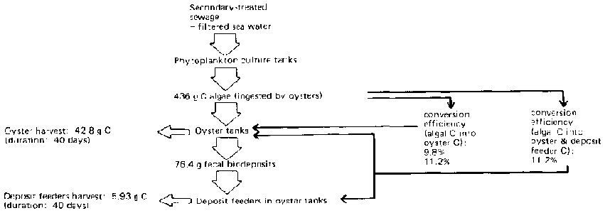 The addition of a detritus feeder (a polychaete worm) to an algae-oyster culture system (Figure 8) increased biomass conversion efficiency from 9.8 per cent (oysters only) to an overall 11.2 per cent efficiency for an oyster-cum-worm polyculture system (18).