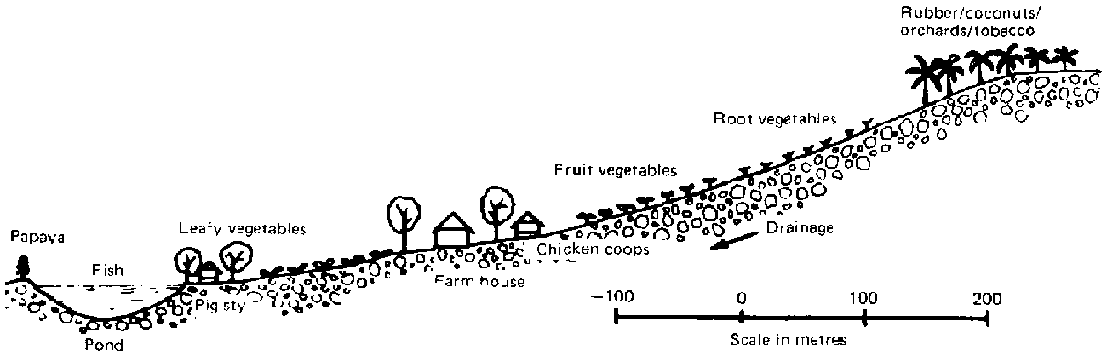 Another pattern for land and water animal-rearing presents itself through the placing of pigsties partially over the ponds, in such fashion that wastes from the pig platform can be sloshed down into the ponds. The ecological basis for this practice was discussed earlier. The technique has been pioneered in Malaysia, with water hyacinths grown on part of the pond surfaces being incorporated into the pigfeed, and with the fertile pond water also being used to water market garden crops (Figure 9) (21). Such integrated farming systems that can amortize themselves and bear profit after three years depend, of course, on year-round availability of water and on having a suitably sloped terrain.