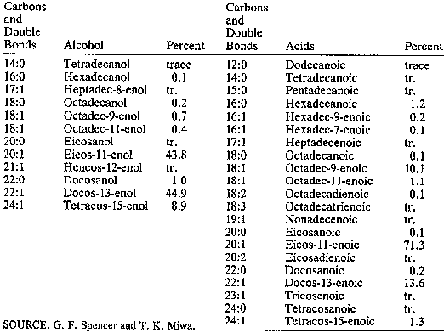 The esters are composed almost entirely of straight-chain acids and alcohols. The acids are a mixture of eicosanoic (C20) and docosanoic (C22), with small quantities of palmitoleic (C18) and oleic (C16). The alcohols are a mixture of eicosanol and docosanol, with smaller quantities of hexacosanol and alcohols of lower molecular weight.