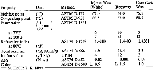 Wax-in-water emulsions have been prepared from hydrogenated jojoba wax. The wax emulsified easily, and the prepared emulsion showed no sign of water separation - an indication of good stability - after more than one month (Information from T. Miwa. The emulsifying agents were 4 percent stearic acid and 2 percent triethanolamine, and the amount of wax was 30 percent in water).