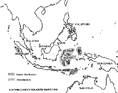 Hybrids between the Sulawesi warty pig and the common domestic pig occur on New Guinea, Ternate, Morotai, Bacan, Amron, Seram, Kei island, Aru island, and Sulawatti.