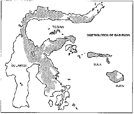 The babirusa is unique to a few islands of eastern Indonesia: north, central, and southeast Sulawesi, the Togian Islands, and the Sula (Taliabu and Sulabesi) and Buru Islands. On Sula and Buru it is probably not native but was introduced in prehistoric times.
