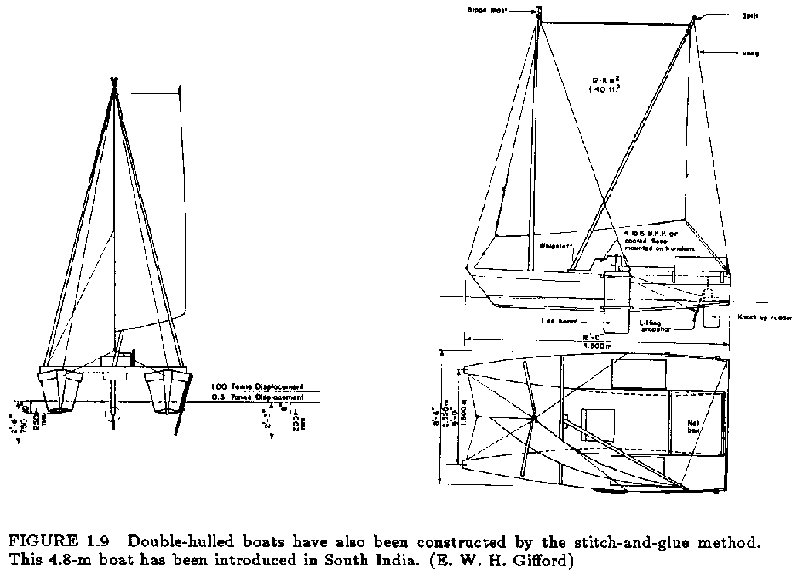 Double-hulled boats have been constructed by stitch-and-glue methods. They can be landed on the beach and offer stability and a large platform for fishing. One small version, the 4.8-m Sandakipper, was also introduced into South India (figure 1.9). It can carry half a ton of gill net and an additional ton of catch.