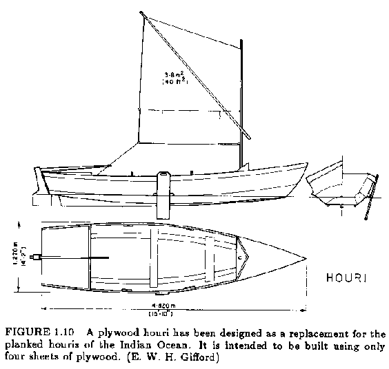 A plywood houri has also been designed as a replacement for the dugouts and planked houris of the Indian Ocean (figure 1.10). Built from only 4 sheets of plywood, it can be rowed, paddled, or powered with a 4-hp motor.