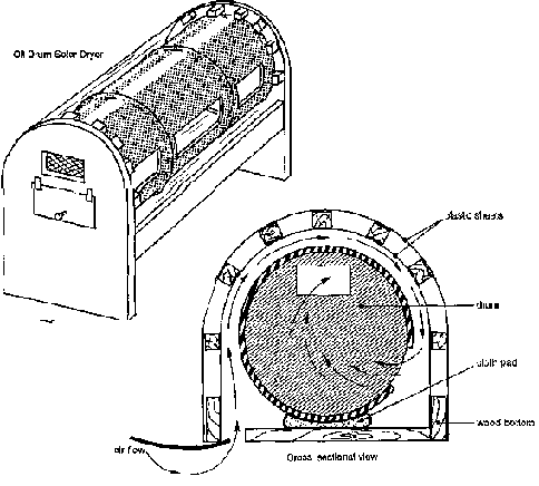 An oil drum solar drier has a creative design (figure 5.8). The ends of the drum are removed and three rectangular ports are cut in the side. The drum is mounted on a wooden frame that includes air vents and access doors on both ends of the drum. Two sheets of clear plastic enclose the drum. These allow sunlight to heat the drum and, because of the air space between the two sheets, provide insulation to retain the heat. The outside of the drum is painted black to absorb solar radiation and the inside is painted white. Cool air enters the base of this unit and is heated as it passes between the exterior of the drum and the plastic sheets. This heated air then enters the drum through the rectangular ports and passes over the trays of fish in the drum and out through the vents at the ends of the drier.