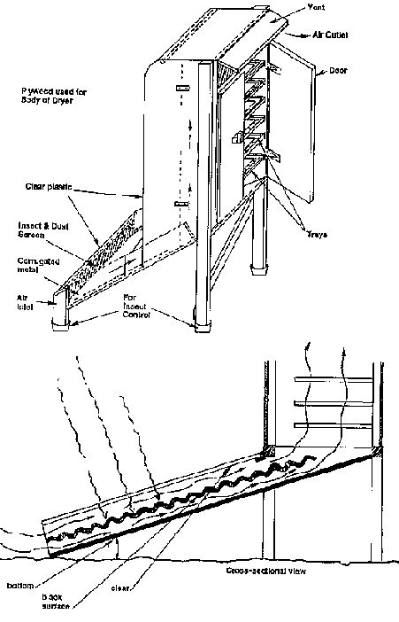 The body of the drier is trapezoidal and is made of wood or aluminum frames covered with polyacetate film. Black film covers the bottom of the drier. The side walls have up to 4 doors that allow 14 trays (114 x 53 cm) to slide into the drier. Woven nylon screen is used to line the bottom of the trays. The top portion of the back wall has several screened warm-air outlets.