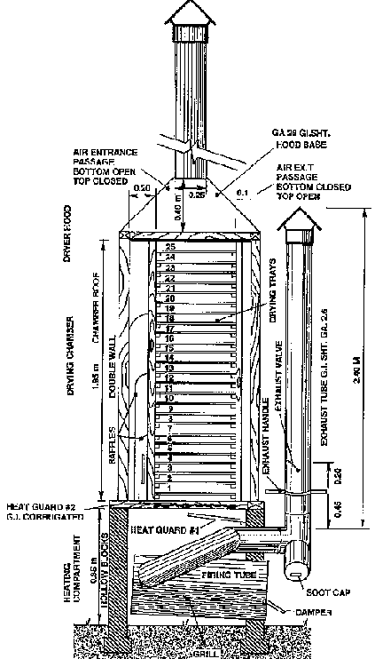 At the base of the structure is a furnace made of hollow blocks, with inside dimensions of 0.90 x 1.20 x 0.85 m. An exhaust tube carries smoke and gases outside the system. The furnace and drying chamber are separated by a corrugated, galvanized iron heat guard. This guard has a 20-cm opening through which the hot air can pass into the drying chamber that contains 25 trays. Air vents are adjusted to ensure an optimum drying temperature of 55°-60°C.