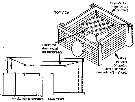 A variation of the mud stove involves using 250-gal steel drums instead of mud for the construction of the cylinder. The drums are cut along their length and rejoined to form a larger cylinder. Fish are smoked on grills within this cylinder.