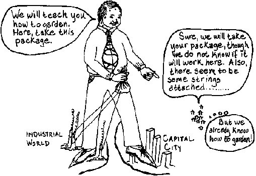 We believe that to be sustainable, development that involves outsiders must be a cooperative venture. Local people guide this process and project workers are resources for them. Community members must take pride in themselves, demand control of the changes affecting them, and work with and learn from project workers as equals. Project workers, especially those from outside, must also learn to work with community members as equals, while recognizing that the local people must guide the projects direction. Project workers must respect and support local skills and knowledge, and always keep in mind the ultimate goal of improving peoples well-being in a way that is both socially and environmentally sustainable. Gardens that support self-sufficiency by using local resources, improving nutritional status and incomes, and protecting the environment, can make an important contribution to finding solutions.