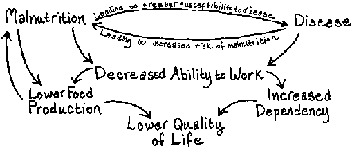 Nutrients are the chemical compounds that living plants and animals need for growth, physical maintenance, work, reproduction, and combating disease and other stresses. Nutrition is the study of the intake of food and the use of food nutrients by living organisms. Good nutrition is essential for good health (Figure 2.1). Malnutrition, the lack of required nutrients, is a major problem in drylands, especially for poor households. Malnourished people are more vulnerable to disease; at the same time, disease often contributes to malnutrition. People suffering from disease and malnutrition are not able to work as productively as healthy, well-nourished people. This increases dependence on outside help and reduces the quality of life (Figure 2.2). This can become a self-perpetuating cycle that affects a household, a community, and even a nation.
