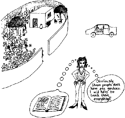 We feel very strongly that the first thing any garden project field worker should do is try to grow a garden just as the people in the community do. If there are no local gardens then the field workers garden should use only resources that are readily available to local households. By doing this she gains an understanding of gardening conditions in the area, including local resources, skills, and problems. She also demonstrates that local people are the focus of the project and that she recognizes their skills and knowledge. Only then will she begin to appreciate local conditions and be able to work with gardeners or those interested in gardening to support and improve gardening in the community.