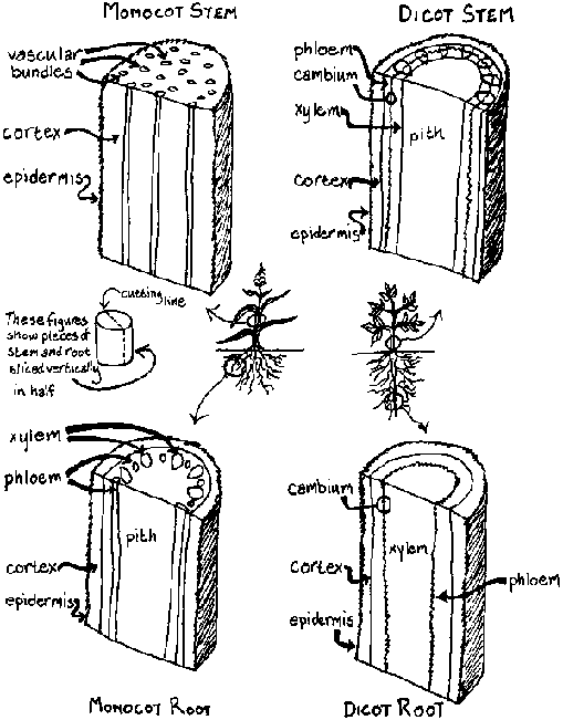 In monocots the phloem and xylem tissues are grouped together in vascular bundles running vertically through the plant. In dicots the phloem is a distinct layer separated from the xylem by a thin layer of cambial tissue (Figure 5.3). These continuous layers of phloem and cambial tissue make grafting and layering of dicots possible (sections 7.6 and 7.7), whereas with monocots these techniques are not possible.