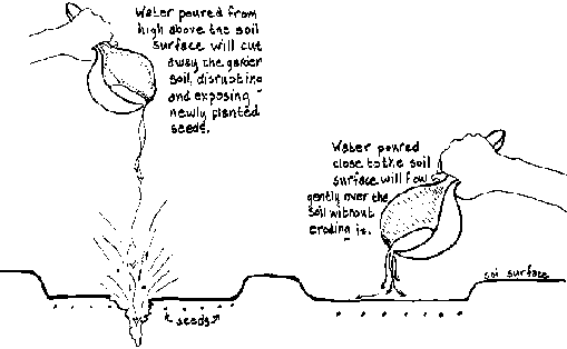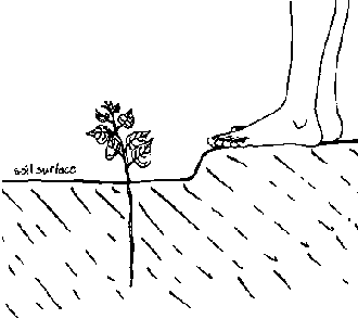 Under sunny, dry, hot conditions transpiration rates are extremely high. If the soil is unable to provide enough water to keep up with the rate of transpiration the plant will wilt. If this water loss is not replaced soon, the plant will die. By shading, mulching, and providing garden plants with protection from drying winds the gardener reduces the need for water and so the amount of water that will be lost to transpiration (section 10.8). Directing water down to the roots, for example, with vertical mulch (section 10.8.2), minimizes the amount lost by evaporation from the soil surface, and makes more water available to meet the plants needs. Gardeners also use plants with lower rates of transpiration and other characteristics that make them better able to survive and produce under dryland conditions.